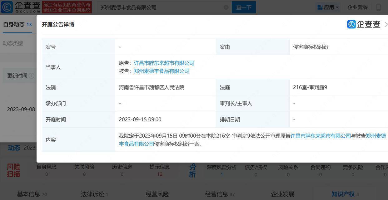 企查查APP显示,该案已于2023年9月在河南省许昌市魏都区人民法院开庭审理。被告郑州麦德丰食品有限公司成立于2022年1月,法定代表人为温某玉,注册资本为200万元,经营范围包含食品销售、食品添加剂销售、供应链管理服务等,该公司已注册“黄金万两”商标。值得注意的是,近年来,该公司多次因抽检不合格被监管部门责令书面限期整改、停止食品生产经营活动。