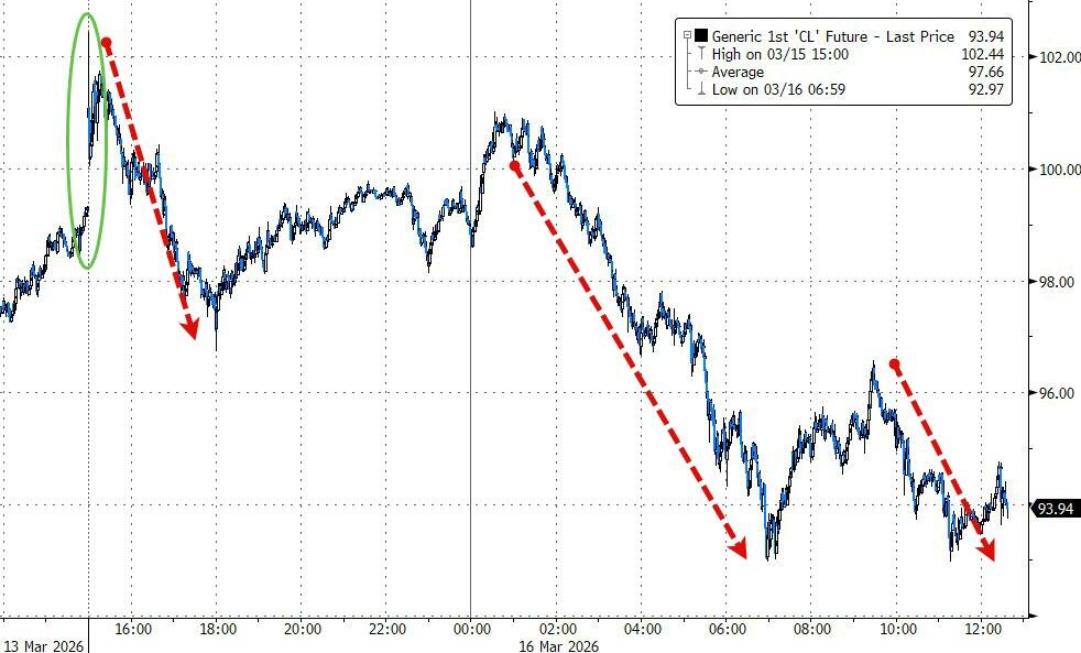 周一午后至晚间(对应欧洲交易时段):有报道显示,伊朗外长发表评论称美国已经“有了教训”,引发了可能形成“退出策略(off-ramp)”的希望,油价扩大跌幅。 周一夜间(对应美股盘前时段):美国财长贝森特出面保证,正尽一切努力加强对霍尔木兹海峡过境的支持,并补充说部分船只在美方默许下已通过海峡,油价进一步走低。 今日凌晨00:30(美东时间12:30):特朗普公开宣称“伊朗有想谈判的人”,油价回吐日内涨幅。今日凌晨01:10:特朗普再次表示“认为霍尔木兹海峡很快就会恢复通航”,油价加速下跌。