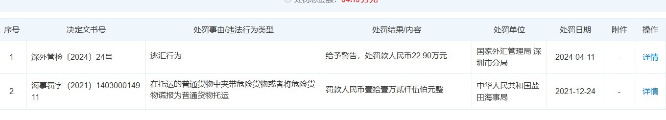 天眼查数据显示,2024年4月,德兰明海因存在逃汇行为,被国家外汇管理局深圳市分局依法处以22.90万元罚款。不仅如此,2021年还曾因在托运的普通货物中夹带危险货物或者将危险货物谎报为普通货物托运被处罚11.25万元。
