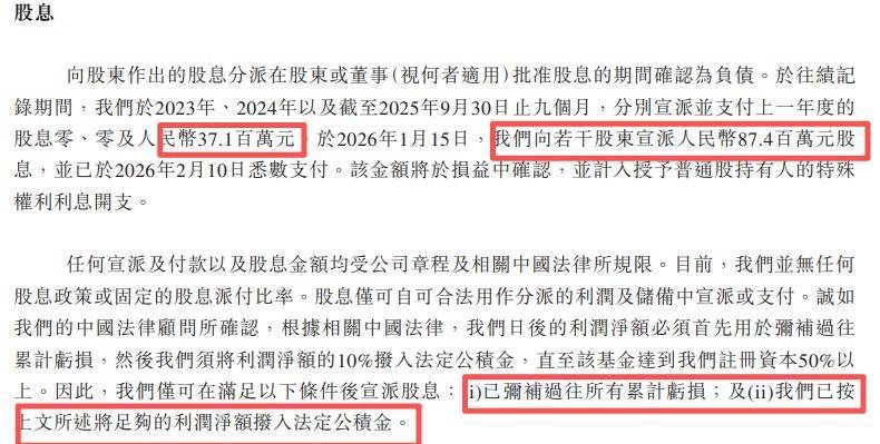 有意思的是,招股书德兰明海明确援引中国法律及法律顾问意见,强调宣派股息的前提是 “已弥补过往所有累计亏损” 且 “按规定拨入法定公积金”,同时明确股息 “仅可自可合法用作分派的利润及储备中宣派或支付”。但事实是,公司在累计亏损未弥补的情况下,于 2025 年宣派并支付 3710 万元股息,2026 年 1 月又宣派 8740 万元股息,直接违背了其披露的派息核心前提。