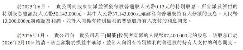 这种行为与规则的冲突,还通过特殊会计处理进一步凸显。德兰明海招股书指出,2026 年宣派的 8740 万元股息并未从留存收益中列支,而是 “于损益中确认,并计入授予普通股持有人的特殊权利利息开支”。这种处理方式本质上是通过会计分类调整,规避了 “无利润不分派” 的常规限制,与 “股息须来自可分配利润及储备” 的原则形成直接对立,使得文字层面的合规承诺与实际操作出现根本性割裂。